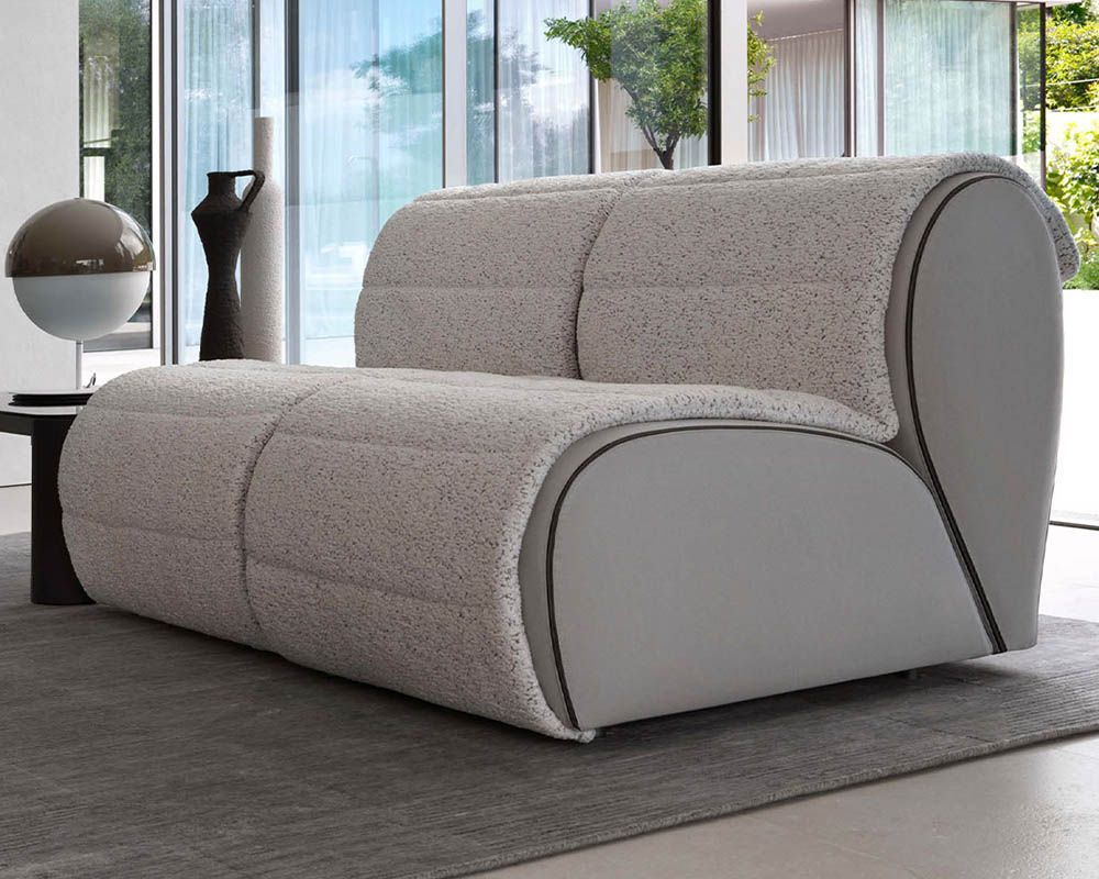 Volumi generosi, braccioli ampi, sedute profonde, schienale con cuscini leggermente curvati. Ogni dettaglio è accuratamente studiato per trasmettere una sensazione di accoglienza, un invito ad una seduta informale e improntata sul relax davanti alla tv, per leggere, riposare e conversare. Sono in particolare i cuscini di schienale piegati all’indietro a delineare questo stile rilassato, con una cucitura orizzontale “a taglio” che sembra assecondare la naturale flessione della schiena.