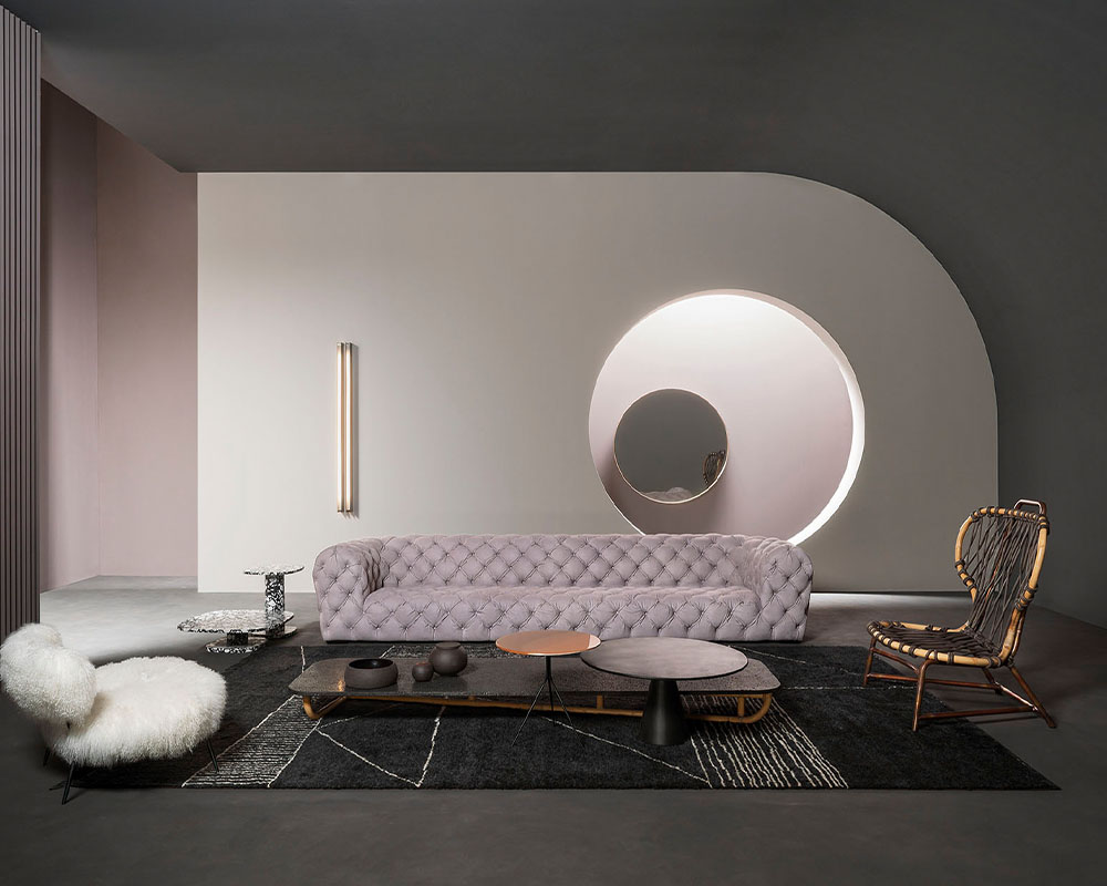 L’estetica alternativa porta la firma di Umberto Asnago, che ha disegnato in esclusiva per il brand uno scultoreo divano dal design organico capace di evocare, seppure in versione attualizzata, il celebre divano a fagiolo degli anni ‘50.