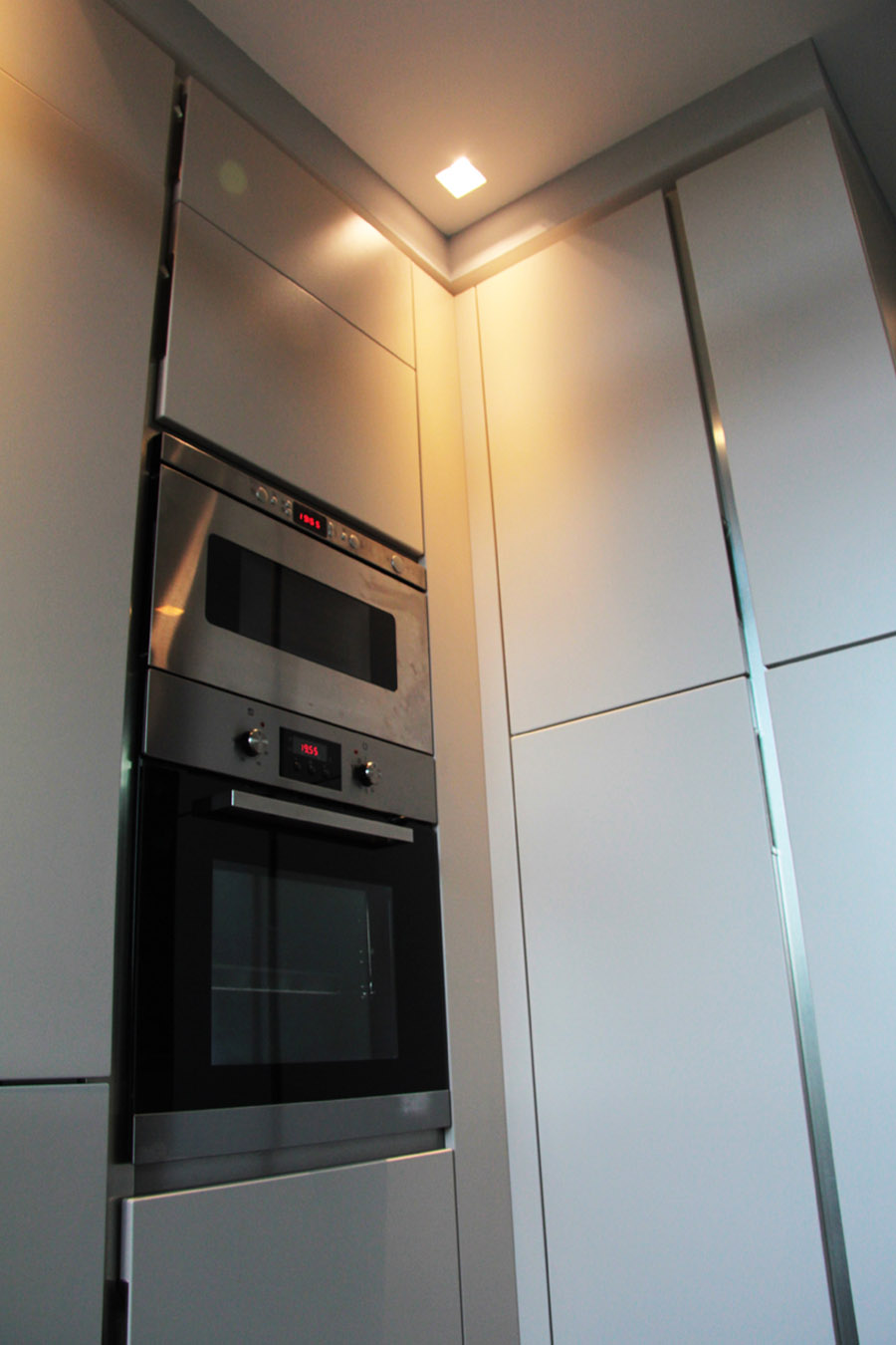 Il laccato ecrù è la caratteristica più evidente nella cucina di Snaidero che presenta un’isola imponente con un piano snack per servire la colazione, essa stessa fa da spartiacque con la zona living e le funzioni sono ben visibili nella loro imponenza, un piano cottura da 90 molto tecnico servito dalla cappa a soffitto che riempie la visuale con la sua estensione da L.180cm, qui si uniscono funzione ed estetica. Le colonne sono ad angolo con una soluzione molto suggestiva e pratica, accolgono gli elettrodomestici Aeg molto stilosi e raffinati nell’estetica e altrettanto tecnici capaci di soddisfare i gusti più esigenti nell’arte del cucinare.